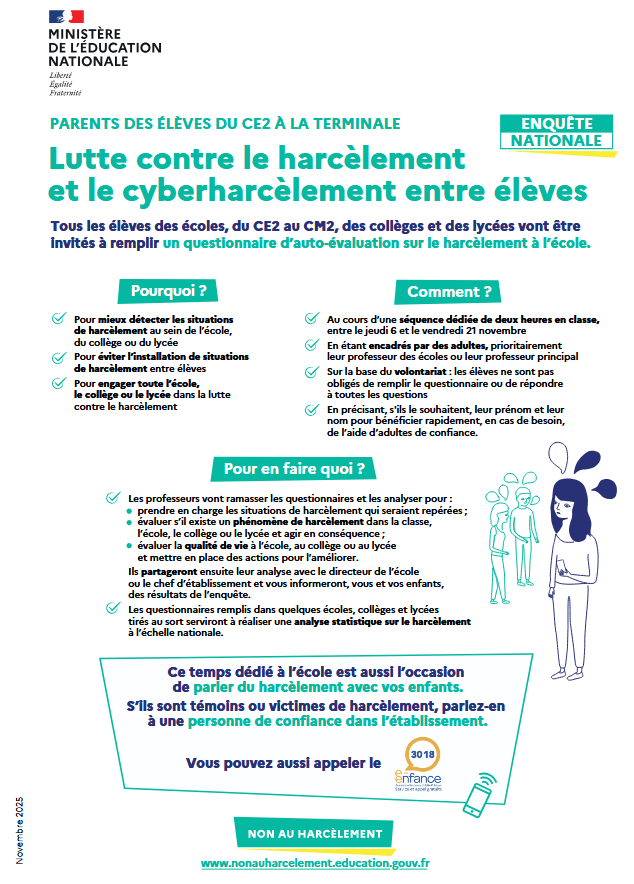Infographie et courrier du ministère à destination des parents dans le cadre de la passation d'un questionnaire d’auto-évaluation à destination des élèves visant à évaluer s’ils sont victimes de harcèlement scolaire.